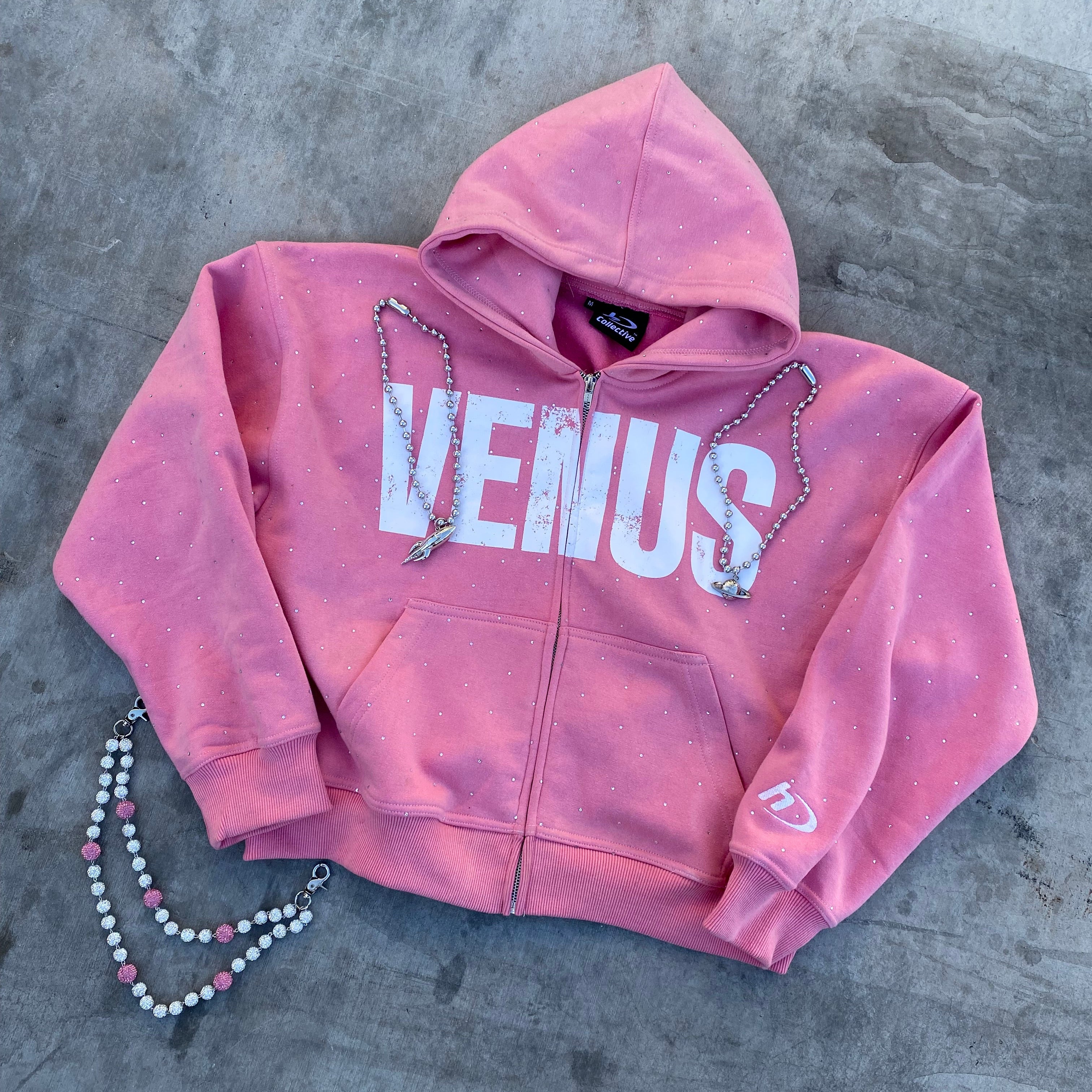 Pink zip up hoodies with rhinestones. Oversized and very slightly cropped. Fit true to size. Chains and accessories sold separately.